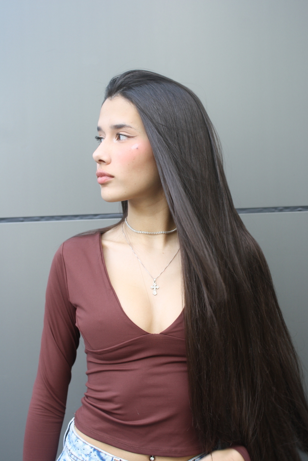 A blusa tem uma modelagem justa ao corpo com um decote em V que valoriza o seu busto e sua silhueta. A região dos seios contém tecido duplo, garantindo mais conforto e segurança.